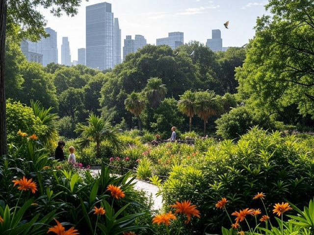 Green urban park with native plants, wildlife, and people enjoying nature amidst city skyscrapers